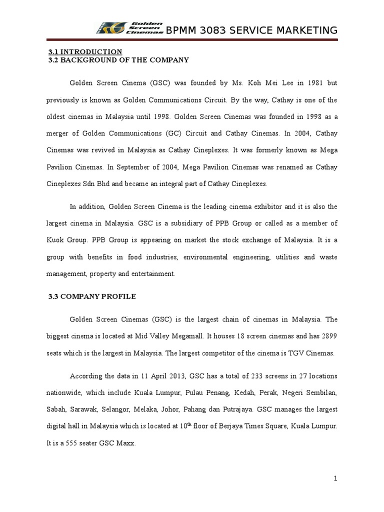 Background of golden screens cinema(gsc) golden screen cinemas is acknowledged as the largest chain of cinemas in malaysia and it has the credit of housing the largest 18 screen cinemas in malaysia.