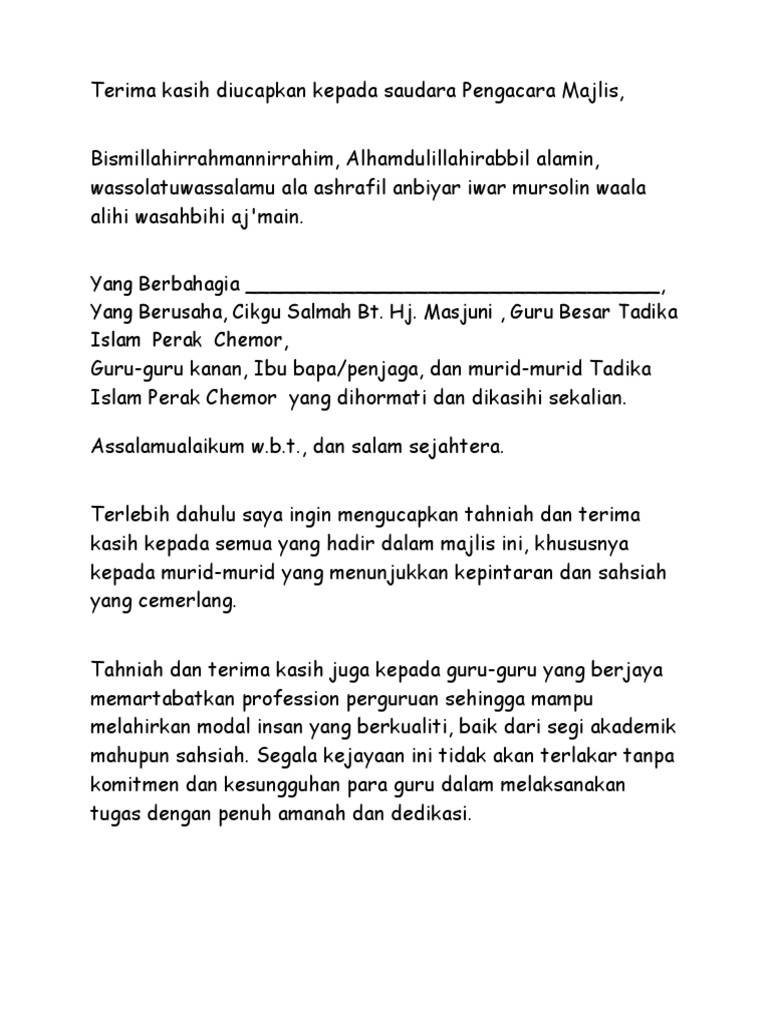 Akhir kata, saya merakamkan ucapan syabas dan tahniah kepada semua penerima anugerah dan terima kasih daun keladi kepada jawatankuasa hari anugerah cemerlang dan graduasi 2016 sekolah kebangsaan kampung kuala pajam. S u h a i m i s a i d | s h a h r a z a t m o h d s h a h i n d a r terima kasih diucapkan kepada saudara/saudari pengacara majlis, bismillahirrahman nirrahim, alhamdulillahi rabbil alamin, wassolatuwassalamu ala ashrafil anbiyar iwar mursolin waala. Dato' sri zohari bin hj akob ketua setiausaha ybrs. 1 | p a g e t e k s u c a p a n y d p p i b g b y : Teks pengacara majlis hari anugerah kecemerlangan.