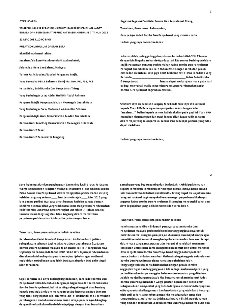 1 teks ucapan sempena majlis perasmian penutupan perkhemahan kadet bomba dan penyelamat peringkat daerah bera ke 7 dengan lafaz bismillahirrahmanirrahim, saya dengan sukacitanya merasmikan majlis penutup perkhemahan kadet bomba & penyelamat.