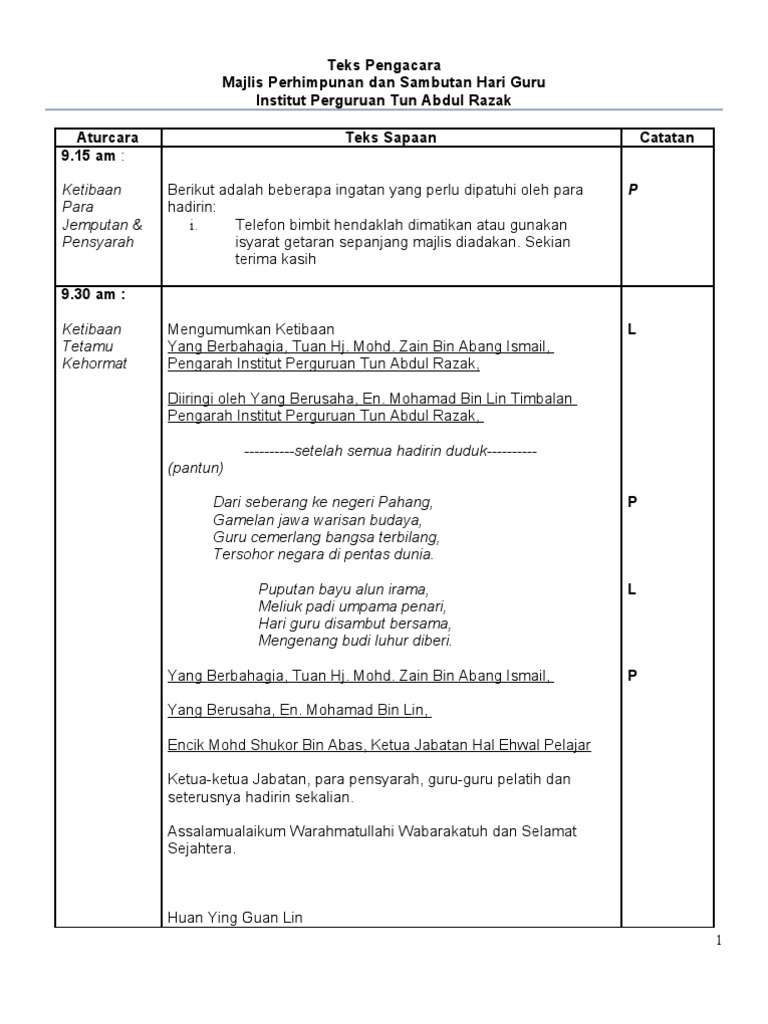 1 from Ucapan guru ايها الحاضرون والحاضرات Alhamdulillah, bersyukur kita kehadrat ilahi kerana dengan limpah kurnianya dapat kita berkumpul pada hari ini di majlis perpisahan saya yang akan mula bertugas di sekolah. Sampai akhirnya dia ngomong kamu lucu juga yach., nggak kaya cowok yang laen.maksud kamu ? tanyaku lagi.biasanya mereka baru ngobrol. Teks ucapan guru besar sempena hari anugerah cemerlang 2013. Aku mencuri pandang sedikit sambil terus berjalan. Contoh teks pengacara majlis / ucapan emcee majlis persaraan cikgu. Contoh teks pengacaraan majlis formal. Contoh teks perhimpunan bahasa arab.
