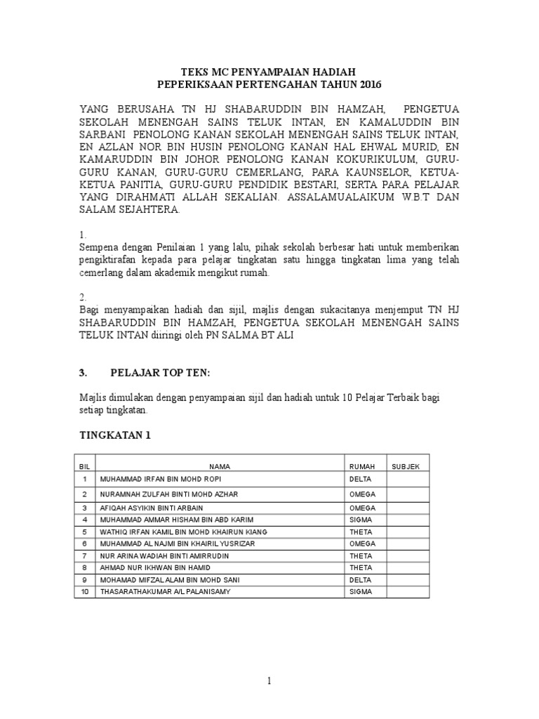 Teks Ucapan Majlis Persaraan from imgv2-2-f.scribdassets.com Anugerah ini adalah manifestasi keprihatian parlimen malaysia kepada warganya yang telah memperlihatkan karekter sebagai modal insan terbaik dengan mempamerkan konsistensi kerja yang berprestasi tinggi untuk. Jika ada, ianya kebetulan dan takdir semata. Hadiah daripada wakil badan pengawas smk bukit besar 2011. Berikut adalah teks ucapan pengacara majlis bagi mesyuarat agung tahunan bakerp kali ke sembilan yang diadakan pada 23 jun 2011. Masuk ke perkarangan majlis, para hadirin diminta untuk berdiri. Tanpa membuang masa lagi, majlis diteruskan dengan penyampaian anugerah kecemerlangan dan penyampaian hadiah bagi pemenang pertandingan inovasi kolej vokasional juasseh bagi tahun 2017. Kini, majlis anugerah pelajar cemerlang telah menjadi program tahunan setiap sekolah dalam hadiah yang disediakan oleh pihak sekolah sewajarnya meliputi kecemerlangan pelajar dalam mata pada majlis anugerah pelajar cemerlang ini, wakil pibg akan dijemput untuk memberikan ucapan. Berikut adalah teks pengacara majlis, mc untuk majlis sambutan maulidur rasul peringkat sekolah menengah dan rendah.